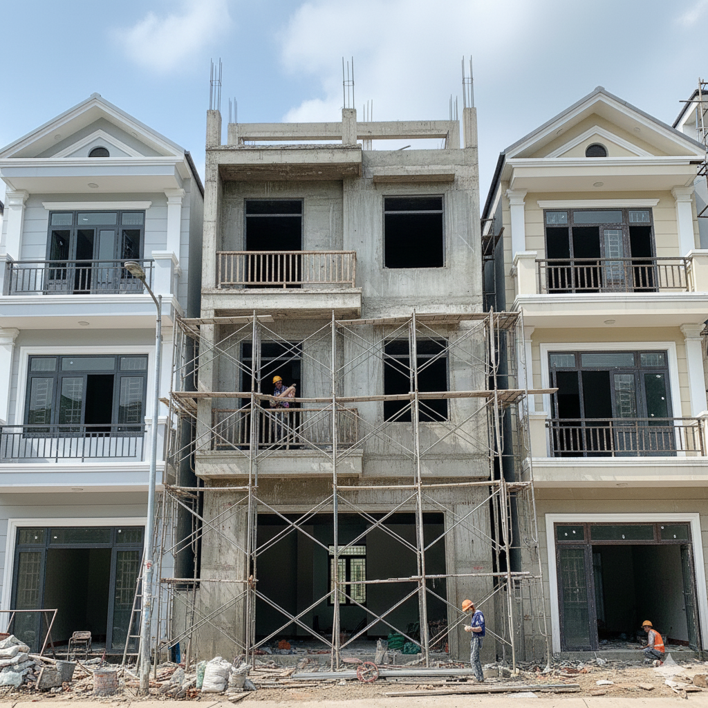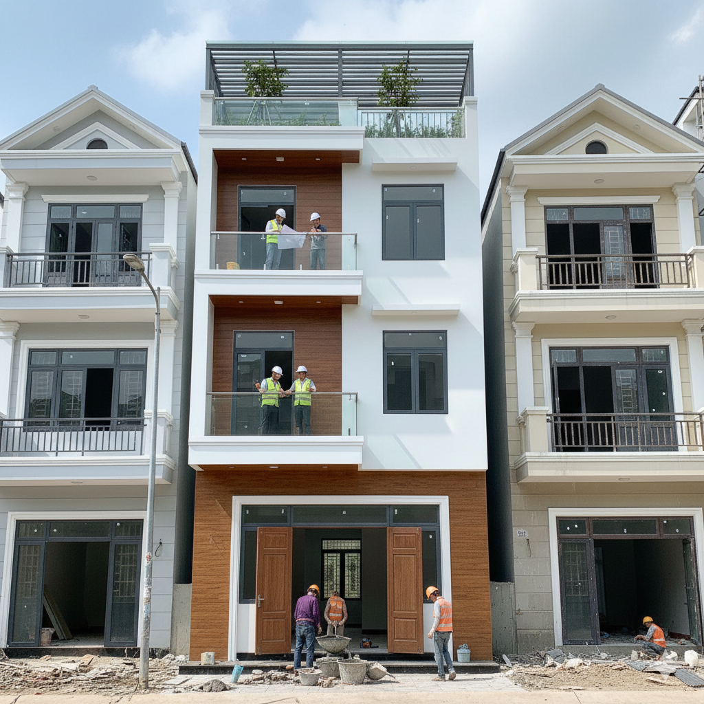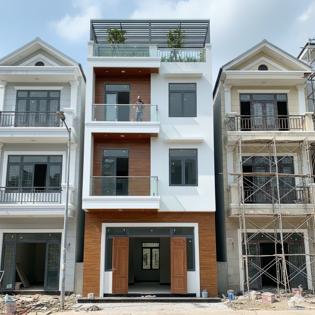 nhà ống trong khu dân cư đô thị. Khác với xây dựng công nghiệp, nhà phố đòi hỏi kỹ thuật thi công tinh gọn,